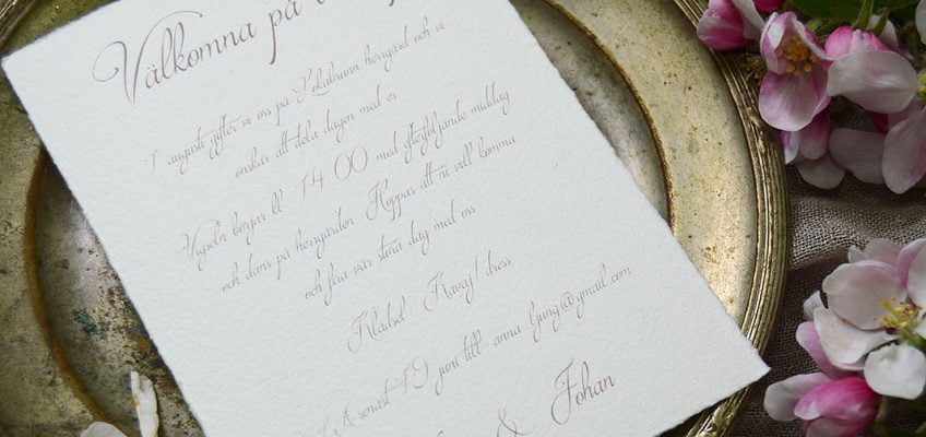Produktbilder kommer finnas här inom kort. Särö trycks på ett handgjort papper tillverkat i Sverige. Papprets lena bomullsyta och rivna kanter kännetecknar ett äkta handgjort papper. Pappret har en svag gräddvit ton.Typsnittet har ett kalligrafiskt snitt och kan fås i den färg ni önskar. På bilderna ses den i en rosa, en grön och en grå ton. Men här väljer ni vilken färg ni vill och våra designers gör den i er färg och skickar ett korrektur innan tryck. Produktbilder kommer finnas här inom kort. Vill du redan nu se fler bilder eller ha mer information så skicka ett mail till info@bjud-in.se. Vill du beställa den så gör du det genom att maila till info@bjud-in.se.