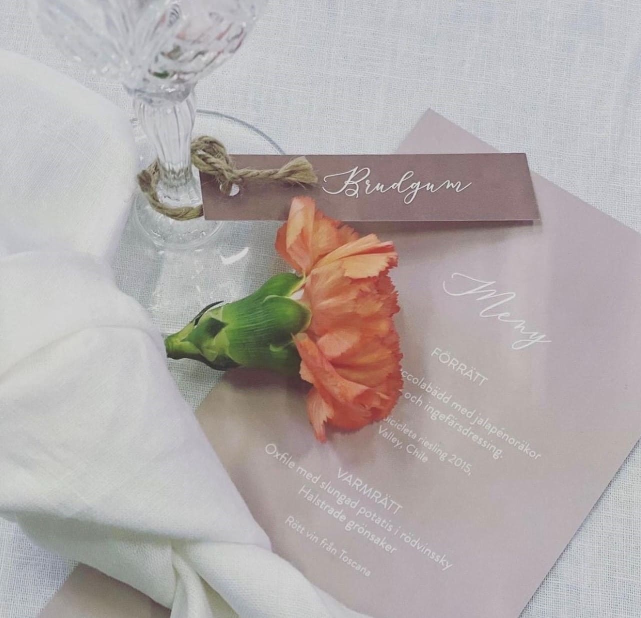 Tips från vår designer: Välj exempelvis beige färg på placeringskorten och en annan färg på fest- och vigselprogram. Då går det i samma stil som inbjudningskortet, där kortet har en färg och tagen en annan.